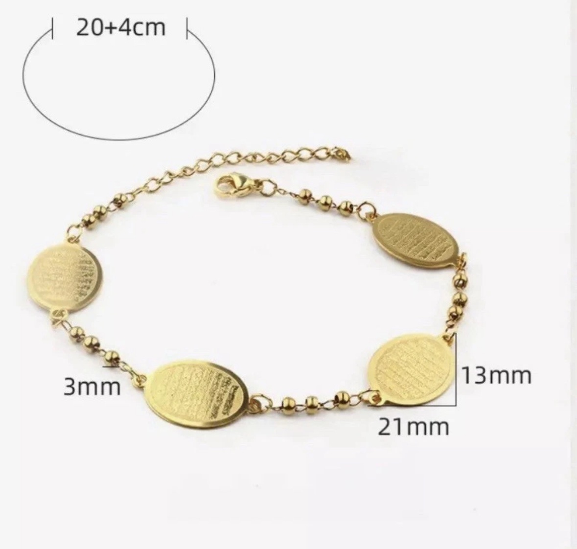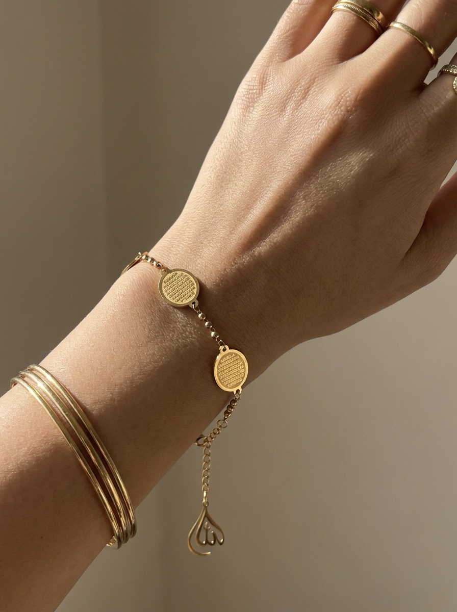 Carry faith in style with this Ayatul Kursi charm bracelet. Featuring a delicate gold-plated chain and a beautifully engraved Ayatul Kursi charm, this bracelet is crafted from high-quality stainless steel for durability and shine. Perfect for everyday wear or as a meaningful gift for Eid, Ramadan, birthdays, and special occasions.
